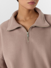 Свитшот из мягкого флиса подарит ощущение тепла и уюта в прохладные дни. Свободный силуэт со спущенным плечом и углубленной проймой обеспечивает комфорт и полную свободу движений._x000D_ Круглая горловина с воротником-стойкой и длинные рукава с манжетами на эластичной тесьме надежно защищают от холода. Короткая металлическая молния, расположенная от линии груди до горла, позволяет легко регулировать воротник и добавляет практичности. <br>_x000D_ <br>_x000D_ Особенностью модели является оригинальная отделка низа: по бокам ткань мягко присобрана на декоративную резинку с фиксаторами, создавая легкий драпированный эффект._x000D_ Свитшот выполнен из полиэстера с флисовой фактурой. Этот материал отличается легкостью, отличными теплосберегающими свойствами и способностью быстро отводить влагу, сохраняя тело сухим. Он приятен на ощупь, не мнется и сохраняет форму после стирки. <br>_x000D_ <br>_x000D_ Эта модель станет идеальным выбором для прогулок, занятий спортом на свежем воздухе или отдыха дома, легко сочетаясь с джинсами, леггинсами или спортивными брюками._x000D_