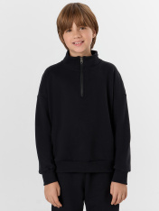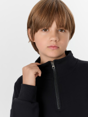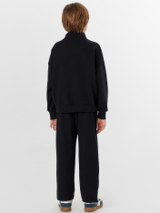 Черный спортивный костюм для мальчиков — это комфорт и практичность для активного образа жизни. Набор из свитшота и брюк-джоггеров выполнен из хлопка, который обеспечивает мягкость, воздухообмен и безопасность для детской кожи._x000D_ Свитшот свободного кроя с застежкой-молнией и воротником легко надевается и снимается. Спущенные плечи и длинные рукава на манжетах из рибаны не сковывают движений. Брюки-джоггеры с эластичным поясом и регулировочным шнурком обеспечивают идеальную посадку, а боковые карманы удобны для мелочей. Низ брюк обработан резинкой для аккуратной фиксации.<br>_x000D_ <br>_x000D_ Этот костюм подойдет для прогулок, спорта или отдыха. Если вы ищете, где купить детский спортивный комплект, который сочетает натуральные материалы, продуманныйкрой и универсальность, этот набор станет отличным выбором._x000D_