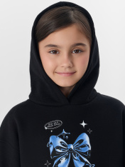 Худи для девочек, свободного силуэта (оверсайз), с капюшоном. Горловина округлой формы. Капюшон со средним швом, на подкладке из основного полотна. Шов втачивания капюшона закрыт хб тесьмой. Плечо спущено, рукав втачной длинный. По низу рукава отрезная манжета из рибаны. Пояс отрезной из рибаны, отстрочен. По переду карман кенгуру. Брюки для девочек, прямого силуэта. Пояс цельнокроеный с втачной эластичной тесьмой RV40. Пояс прострочен двумя отделочными строчками. По переду обработаны карманы в швах. Низ брюк обработан швом в подгибку на двухигольной плоскошовной машине.