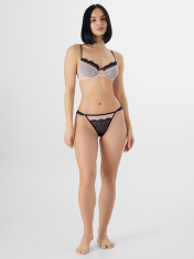 Соблазнительные стринги со средней линией талии. Трусики созданы из нежного эластичного кружева и полупрозрачной сетки. Верхний срез обработан тесьмой, нижние – жилкой. В местах соединения тесьмы – маленькие колечки. Мило, женственно, комфортно! _x000D_ _x000D_