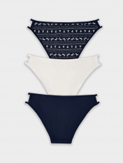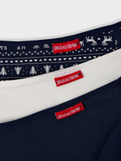 Набор из трех женских слипов с новогодним принтом создан для тех, кто ценит ежедневный комфорт и праздничное настроение. Каждая модель со средней посадкой обеспечивает удобную поддержку и идеальную посадку, которая сохраняется в течение всего дня. Протяжки по боковым швам аккуратно подчеркивают силуэт.<br>_x000D_ <br>_x000D_ Основой для этих трусиков послужил мягкий трикотаж на основе кулирной глади. Его состав с преобладанием натурального хлопка и добавкой эластана дарит коже приятные ощущения. Материал отличается высокой воздухопроницаемостью и гипоаллергенными свойствами, обеспечивая комфорт при длительной носке. Небольшой процент эластичных волокон гарантирует, что слипы сохранят свою первоначальную форму, мягко облегая тело без стеснения движений.<br>_x000D_ <br>_x000D_ Этот набор станет практичным и приятным дополнением, дарящим уверенность и уют в будни и в праздничные дни. Три одинаково удобные пары позволят вам всегда иметь под рукой именно то, что нужно._x000D_