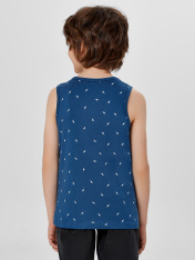 Майка полуприлегающего силуэта из хлопковой трикотажной кулирки. Длина до середины бедер. Горловина круглая, окантована мягкой бейкой. Нижний срез обработан плоским швом. Комфортная классика для вашего мальчика!