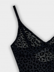 Женское боди из сетки с флоком — это стильная и элегантная модель, которая сочетает в себе легкость, комфорт и выразительный дизайн. _x000D_ Боди имеет конструкцию с мягкими чашками на каркасах, которые обеспечивают поддержку и естественную форму груди. Ластовица с подкладкой гарантирует гигиеничность и комфорт. Бретели регулируются по длине, что позволяет подобрать идеальную посадку. Застёжка на три кнопки внизу изделия делает его удобным в носке. Все края и швы обработаны эластичной тесьмой, что обеспечивает аккуратное прилегание.<br>_x000D_ <br>_x000D_ Боди изготовлено из полиамида, эластана и хлопка. Такой состав делает материал прочным, эластичным и дышащим, способным сохранять форму даже при регулярной носке. Чёрный цвет и сетчатая фактура придают модели универсальность, позволяя носить её как самостоятельный элемент или в сочетании с другой одеждой. _x000D_ <br>Это боди станет отличным выбором для особых случаев или для создания смелых повседневных образов._x000D_