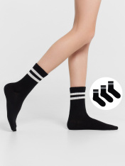 Носки детские из высококачественного хлопка с высокой резинкой и рисунком в виде поперечных полосок мультипак (3 пары). Натуральные волокна отлично пропускают воздух и впитывают влагу, дарят ощущение комфорта в течение дня. Благодаря небольшому количеству эластана в составе, носки удобно сидят на ножке и не сползают, хорошо тянутся и легко надеваются. Пятка и мысок дополнительно укреплены для защиты от протирания. Резинка мягко, но надежно удерживает носки, не оставляя на коже следов. Этот набор детских носков точно понравится вашей маленькой моднице. Рекомендуем!