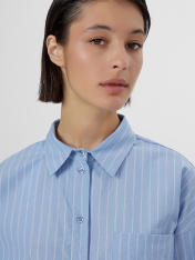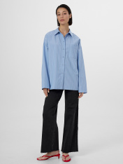 Эта женская рубашка воплощает комфорт и лаконичность. Свободный силуэт позволяет чувствовать себя непринужденно, не жертвуя стилем. Спущенное плечо и длинные рукава добавляют расслабленного шарма, а классический воротник и застежка на пуговицах придают модели нотку строгости. Хлопковая ткань — гарантия мягкости, дышащих свойств и повседневной практичности. Накладной карман — небольшой, но выразительный штрих, придающий рубашке визуальный акцент. Обработка краев делает изделие аккуратным и завершенным, а прямой низ оставляет простор для разных стилистических решений — от классики до кэжуал.