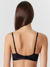 Бюстгальтер с мягкой подформовкой на жестких формованных чашках, без каркаса. Ластовица цельная с деталью стана на подкладке из микрофибры. Пластины в бок. деталях стана. Верхний срез стана обработан тесьмой. Нижний срез стана обработан окантовкой с внутренней тесьмой. Бретели. Кольца и регуляторы. Застежка двойная