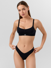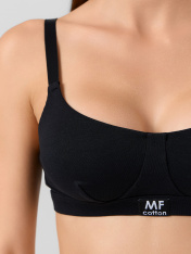 Бюстгальтер с мягкими чашками, без каркасов. Чашки выполнены из хлопка, на подкладке из хлопка. Чашки с вытачками. Чашки обтачаны подкладкой по линии декольте и пойме, внутри жилка. Ластовица выполнена из хлопка на подкладке из хлопка с монокапрономвнутри. Отрезные бочки из хлопка на подкладке из хлопка. Верхний срез бочка обработан жесткой тесьмой, по размерам (внутренняя обработка, по лицевой стороне строчки нет). Нижний срез стана обработан обтачкой из хлопка с внутренней резиной. Бретель срегулировкой по размерам. Застежка двойная.