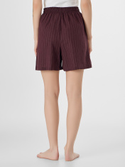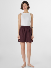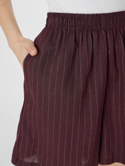 Домашние шорты — это легкая и дышащая модель для комфортного отдыха. Модель свободного кроя не стесняет движений и помогает телу оставаться в комфортной температуре. Пояс со встроенной эластичной тесьмой хорошо держится на талии. Низ изделия аккуратно подшит._x000D_ Шорты изготовлены из льна и вискозы. Этот состав объединяет натуральную прохладу и воздухопроницаемость льна с мягкостью и гладкостью вискозы, обеспечивая комфорт в теплую погоду. Классическая коричневая полоска делает шорты стильным и универсальным элементом домашнего гардероба.<br>_x000D_ <br>_x000D_ Они отлично подойдут для расслабленного дня дома, отдыха или в качестве легкой домашней одежды в летний сезон._x000D_