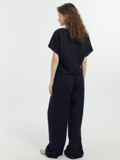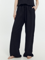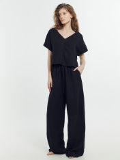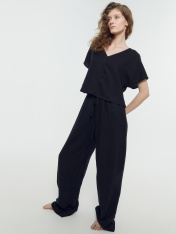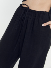 Брюки с посадкой на талии свободного силуэта. Пояс цельнокроеный с резиной внутри. По центру пояса пробиты петли, протянута бейка из основного полотна. На передних деталях карманы "хулиганы". Низ изделия застрочен швом в подгибку.
