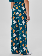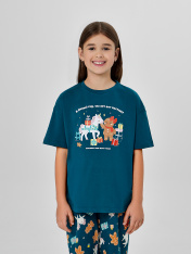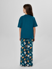 Комплект для девочек состоит из джемпера и брюк._x000D_ Джемпер прямого, свободного силуэта. Перед и спинка цельнокроеные. Плечо слегка спущено. Горловина круглой формы с притачной обтачкой из основного полотна._x000D_ Рукав втачной, одношовный, короткий. _x000D_ Брюки прямого, свободного силуэта. Пояс цельнокроеный с эластичной тесьмой внутри(внутрення резина 30RV), ширина 30 мм._x000D_ Низ джемпера и брюк обработан на 2-х игольной плоскошовной машине швом в подгибку_x000D_