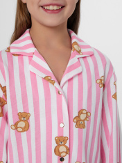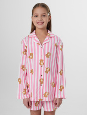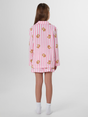 Комплект для девочек состоит из рубашки и шортов. _x000D_ Рубашка прямого силуэта, с отложным воротником, спинка цельнокроеная._x000D_ Плечо слегка спущено. Рукав втачной, одношовный, длинный. _x000D_ Центральная застежка переда на пуговицах (5 шт) d= 10 mm._x000D_ Короткие шорты со средней посадкой талии. Пояс цельнокроеный с эластичной тесьмой внутри (внутрення резина 30RV), ширина 30 мм. Низ рубашки и шортов обработаны на 2-х игольной плоскошовной машине швом в подгибку.