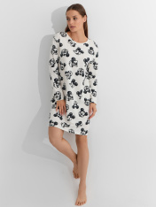 платье женское свободного силуэта. Горловина круглой формы с обтачкой из основного полотна. Рукав втачной длинный, линия плеча немного спущена, рукав обработан вподгибку. Низ застрочен швом в подгибку.