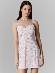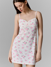 Сорочка полуприлегающего силуэта, короткая на бретелях. Горловина V-образной формы. Горловина спинки и проймы окантованы бейкой из основного полотна, с эластичной тесьмой внутри (жилка тканая 6мм WT4-6). Бейки по проймам переходят в бретель. На детали переда подрез под грудью. Лиф двойной со средним швом и сборкой на эластичную тесьму (жилка тканая 6мм WT4-6). Нижний срез сорочки обработан швом вподгибку.