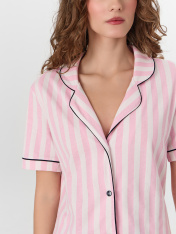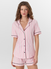 Пижама женская с шортами — это воплощение уюта и элегантности для вашего домашнего отдыха. Комплект в «костюмном стиле» состоит из прямого жакета с отложным воротником, а также свободных мини шорт с эластичным поясом. Жакет застегивается на пуговицыи украшен контрастными кантами по рукавам, воротнику и передней части, что добавляет образу стильную завершенность. Шорты дополнены атласной тесьмой, которая завязывается на изящный бантик, подчеркивая нежность и внимание к деталям.<br>_x000D_ <br>_x000D_ Мягкий хлопок обеспечивает воздухопроницаемость и комфорт, позволяя коже дышать даже во время сна. Свободный крой не сковывает движений, делая эту женскую пижаму с шортами идеальной для повседневной носки, утреннего кофе или вечера с книгой. <br>_x000D_ <br>_x000D_ Если вы ищете качественную женскую пижаму из хлопка, которая сочетает практичность и стиль, этот комплект станет прекрасным выбором. Широкий размерный ряд, включая варианты для девушек plus-size, гарантирует идеальную посадку для любой фигуры. _x000D_