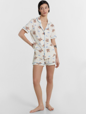 Хлопковый женский комплект актуального свободного силуэта. Рубашка прямая, с отложным воротником и лацканами, короткими рукавами, застегивается на пуговицы. Дополняют ее свободные шорты длины мини, с резиновой тесьмой в поясе и атласной тесьмой, которая завязывается на бантик. Особенность модели – контрастные канты на рукавах, воротнике и передней части рубашки. Рекомендуем для сна, отдыха и домашних дел!
