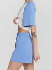 Комплект женский состоит из футболки и шорт. Футболка свободного силуэта. Горловина круглой формы, обтачка из основного полотна. Рукава короткий, реглан. Нижний срез футболки и рукавов обработан швом вподгибку. Шорты прямого силуэта, короткие. Пояс цельнокроеный, с втачной эластичной тесьмой 30RV. Низ шорт обработан швом в подгибку.