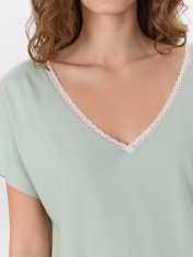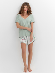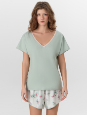 Комплект женский состоит из футболки и шорт. Футболка свободного силуэта. Горловина V-образная с отделкой из кружева, по спинке обтачка из основного полотна. Рукав короткий. Нижний срез футболки и рукавов обработан швом вподгибку. _x000D_ Шорты свободногосилуэта, короткие. Пояс цельнокроеный, с втачной эластичной тесьмой 40RV. По центу пояса пробиты петли, протянут шнур из основного полотна. Низ шорт обработан кантом из основного полотна._x000D_