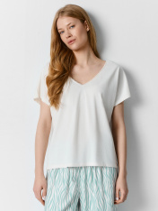 Домашний комплект с принтом — это воплощение нежности и весеннего настроения для отдыха. Он состоит из свободной футболки и прямых бриджей, выполненных из мягкой смесовой ткани, которая дарит коже ощущение шелковистой мягкости и лёгкости._x000D_ <br>Футболка с V-образным вырезом, украшенным кружевом, и короткими рукавами создаёт расслабленный, женственный образ. Бриджи с поясом на эластичной резинке и декоративным шнурком обеспечивают удобную посадку, а атласный кант по низу добавляет изящную завершающую деталь. Нежный цветочный принт наполняет образ романтичностью и свежестью.<br>_x000D_ <br>_x000D_ Состав из вискозы, хлопка и модала обеспечивает идеальный баланс: ткань прекрасно дышит, мягко облегает фигуру и сохраняет свои свойства после стирок. _x000D_ <br>Этот комплект станет вашим любимым спутником для спокойных дней дома, создавая атмосферу уюта, гармонии и заботы о себе