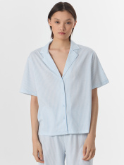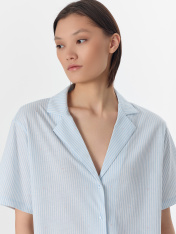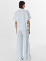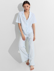 Домашний комплект — нежность и комфорт для вашего отдыха. Набор из свободной рубашки и брюк выполнен из натурального хлопка, который обеспечивает идеальную воздухопроницаемость и мягкость._x000D_ Рубашка с отложным воротником и короткими рукавами создаетэлегантный расслабленный образ. Центральная застежка на пуговицах и аккуратная обработка всех швов подчеркивают качество исполнения. Брюки с эластичным поясом на кулиске мягко сидят на талии, не стесняя движений.<br>_x000D_ <br>_x000D_ Нежный оттенок и классический крой делают комплект универсальным для разных ситуаций. Мягкая ткань не раздражает кожу и сохраняет форму после стирок. В этом комплекте вы будете чувствовать себя уютно и выглядеть стильно даже в моменты отдыха — от утреннего кофе до спокойноговечера с книгой. _x000D_