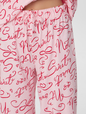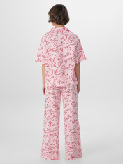 Пижама женская создана для тех, кто ценит комфорт и качество. Рубашка свободного кроя не обтягивает тело, позволяя коже дышать. Отложной воротник мягко обрамляет шею, а короткие рукава не мешают движениям во сне. Застежка на пуговицах удобна в использовании, а аккуратная строчка по низу предотвращает скручивание ткани.<br>_x000D_ <br>_x000D_ Брюки сидят на естественной линии талии. Внутри пояса вшита мягкая резинка, которая надежно держит изделие, не сдавливая живот. Специальная бейка-завязка позволяет регулировать плотность посадки. Широкие штанины не стесняют движений, а ровные швы по низу сохраняют форму после стирок.<br>_x000D_ <br>_x000D_ Оба предмета пижамы выполнены из натурального хлопка, который не вызывает раздражения и обеспечивает комфортную температуру тела ночью. Комплект подходит для ежедневного использования — ткань выдерживаетстирки, не теряя мягкости и цвета.<br>_x000D_ <br>_x000D_ Простота ухода и продуманные детали делают эту пижаму идеальным выбором для спокойного сна и расслабленного отдыха дома._x000D_ _x000D_ _x000D_ _x000D_
