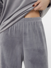 Велюровая женская пижама — это ощущение уюта и нежной роскоши. Комплект состоит из джемпера и брюк, выполненных из мягкого велюра с благородной бархатистой текстурой. Джемпер прямого силуэта с удлиненными рукавами и элегантной горловиной «лодочка» создает расслабленный и изящный вид._x000D_ <br>Брюки свободного кроя с поясом на мягкой резинке обеспечивают комфорт и не стесняют движений во время сна или отдыха. Все края изделий аккуратно обработаны для долговечности и приятного прилегания. <br>_x000D_ <br>_x000D_ Состав с преобладанием полиэстера и добавлением эластана делает велюр упругим, струящимся и простым в уходе. Полиэстер отвечает за износостойкость и лёгкость ткани, а эластан обеспечивает мягкое облегание, помогая сохранять форму после множества стирок. _x000D_ <br>Этот комплект станет любимым спутником для спокойных вечеров и сладкого сна, даря телу нежность и чувство полного расслабления._x000D_