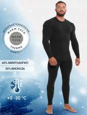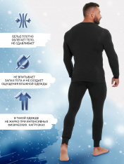 Мужской термо-комплект из полуприлегающего джемпера длиной до линии бедер и облегающих брюк. Рукава джемпера длинные, на манжетах, горловина круглая. Брюки без боковых швов, на манжетах, с эластичной тесьмой в поясе. Все швы плоские и комфортные. Всостав полотна, созданного по японской технологии, входит микроакрил, который благодаря своей толщине (меньше волоса человека в 10 раз), создает своеобразные воздушные карманы между нитями – именно за счет этого свойства джемпер так хорошо согревает. Благодаря эффекту натуральной шерсти выдерживает температуры до -30 градусов Цельсия. Зиму контролируете вы!