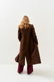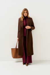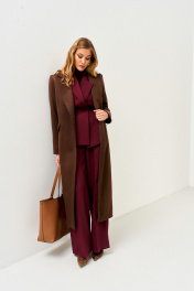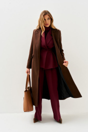 Пальто женское полуприлегающего силуэта с отрезными бочками на подкладке, со смещенной бортовой застежкой на петли и пуговицы с отложным воротником. Рукав втачной двухшовный с имитацией шлицы и отделочными пуговицами. На деталях переда обработаны боковые прорезные карманы с клапаном и одной обтачкой. Спинка разрезная, в среднем шве обработана шлица.