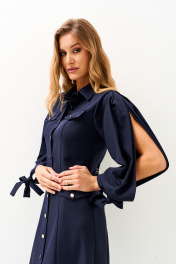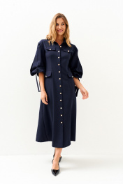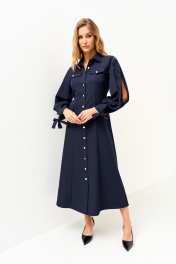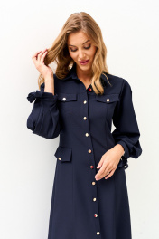 Платье женское прилегающего силуэта с центральной бортовой застежкой на петли, пуговицы с отложным воротником.Рукав втачной, одношовный со складками переходящими в разрезы,по низу рукава притачная манжета переходящая в завязки.На деталях переда обработаны карманы с клапанами (нефункциональные) . Перед и спинка с кокеткамии и вертикальными рельефами.