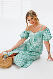 Летнее платье-сарафан с объемными рукавами. Эффектное летнее платье-сарафан с объемными рукавами и летящей юбкой. Бретели обеспечивают комфортную посадку, а сборка на спинке с ниткой-резинкой гарантирует плотное прилегание лифа. Платье отрезное по талии, с юбкой, оформленной оборкой (волан со сборкой) по низу. Сборка под резинку на верхнем и нижнем крае рукавов. Длина миди, без подкладки, с застежкой на петли и пуговицы.Длина юбки - 72-74 см. Длина по боковому шву - 90-91см