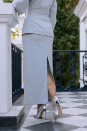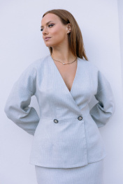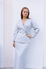 Жакет на запах. Застежка на пуговицы. На подкладке. Очень интересный крой. Рукав 3/4, длина от шеи 71-73 см. Юбка длиной миди, на притачном поясе. Задняя половинка с талиевыми вытачками, со средним швом, заканчивающийся разрезом. Пояс с застежкой петлю и пуговицу. Длина юбки по боковому 100 см Параметры фигуры, на которую подойдет данный костюм: 42 размер - ОГ = 88, ОТ = 68, ОБ = 94 44 размер - ОГ = 92, ОТ = 74, ОБ = 98 46 размер - ОГ = 96, ОТ = 78, ОБ = 102 48 размер - ОГ = 100, ОТ = 82, ОБ = 106 50 размер - ОГ = 104, ОТ = 86, ОБ = 110 52 размер - ОГ = 108, ОТ = 90, ОБ = 114