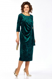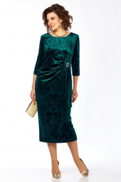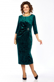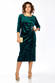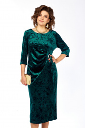 Платье женское, выполнено из бархатного полотна, длиной миди. Спинка со средним швом, шлицей на движение и потайной тесьмой-молнией. Перед с нагрудными вытачками из боковых швов, округлым вырезом горловины, и подрезом от правого плеча. Правая деталь переда присобирается в драпировку в области талии и закреплена декоративной пряжкой. Рукав втачной одношовный, длиной 3/4