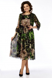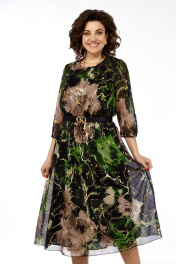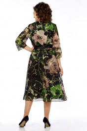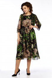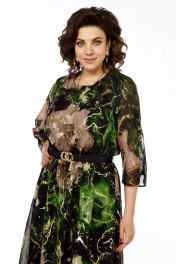 Платье женское, нарядное, выполнено из шифоновой ткани, на трикотажной подкладке. Платье отрезное по талии, в линию подреза вставлена резинка. Перед с нагрудными вытачками из боковых швов и округлым вырезом горловины. Рукав втачной 3/4, с разрезом от плеча и до низа рукава, в разрезе рукава от низа имеется сборка. Длина платья 126см, длина рукава 48 см. Ремень входит в комплект