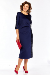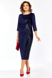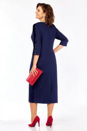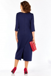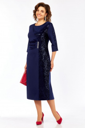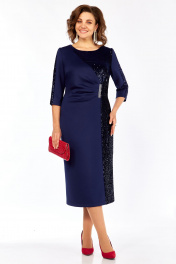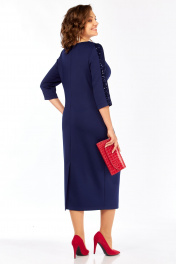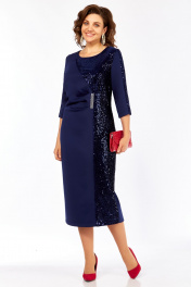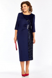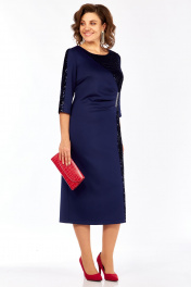 Платье женское, выполнено из бархатного полотна, длиной миди. Спинка со средним швом, шлицей на движение и потайной тесьмой-молнией. Перед с нагрудными вытачками из боковых швов, округлым вырезом горловины, и подрезом от правого плеча. Правая деталь переда присобирается в драпировку в области талии и закреплена декоративной пряжкой. Рукав втачной одношовный, длиной 3/4