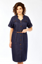 Платье женское прямого силуэта с коротким рукавом, рубашечного типа со спущенной линией плеча. Рукав с небольшим отворотом и патой. В плечевом обрезная кокетка. Перед платья с центральной бортовой застежкой на 7 пуговиц. Горловина платья V-образной формы с воротником стойкой. По переду расположены 2 клапана на линии груди и 2 накладных кармана на линии бедер. На клапанах, патах и рукавах пришиты пуговицы. Сквозь накладных карманов по линии талии продевается съемный пояс.