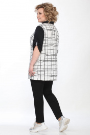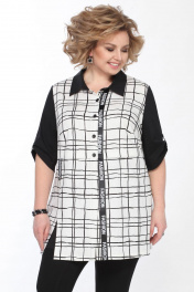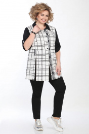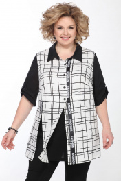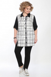 Блузон женский прямого силуэта. Застежка центральная на петли пуговицы, функциональна до уровня груди. Нижняя часть переда двухслойная. Верхний слой из ткани в клетку, нижний из однотона. Рукава выполнены из однотона, длина 3/4, с патами застегивающимися на пуговицы. Отделкой служит декоративная тесьма вдоль застежки и на патах рукавов. Воротник рубашечный с отрезной стойкой. Низ изделия и рукава обработан швом в подгибку с закрытым срезом. Длина по спинке 75 см, длина рукава 35 см, ширина рукава на уровне глубины проймы 56-42 см, 58-43 см, 60-44 см, 62-45 см. Реальные замеры изделия 56 ог-124см, от-127см, об-132см, 58 ог-128см, от-131см, об-136см, 60 ог-132см, от-135см, об-140см, 62 ог-136см, от-139см, об-144см.