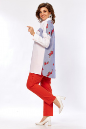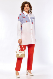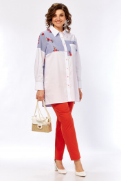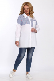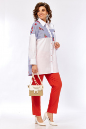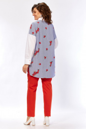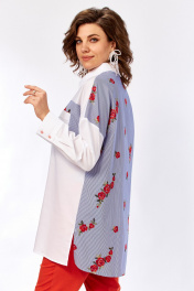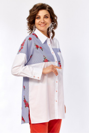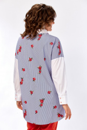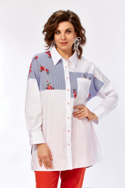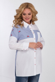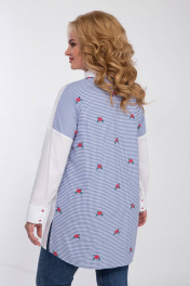 Блузка женская прямого силуэта, скомбинирована из 2-х видов ткани: однотон и полоска. Перед блузки на центральной застежке: петли-пуговицы с притачными планками. Воротник рубашечный на отрезной стойке. Детали переда с отрезными кокетками,на левой полочке накладной карман. В боковых швах выполнены разрезы. Рукав рубашечный со спущенной линией плеча и притачной манжетой. Длина блузки по спинке 82см, длина рукава 43см, ширина рукава на уровне глубины проймы 54-19,5см, 56-40см, 58-41см, 60-42см. Реальные замеры блузки 54 ог-124см, от118см, об-126см, 56 ог-128см, от-122см, об-130см, 58 ог-132см, от-126см, об-134см, 60 ог-136см, от-130см, об-138см.