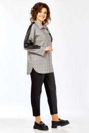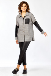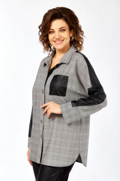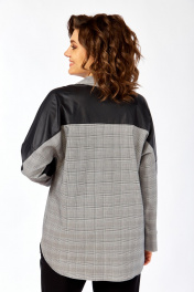 Блузон женский прямого силуэта, комбинированный из 2-х видов ткани: клетка+кожа. Перед блузона на центральной застежке: петли-пуговицы с притачными планками. воротник рубашечный. На левой полочке накладной карман из отделочной ткани. спинка с отрезной кокеткой из отделочной ткани. В боковых швах выполнены карманы. Рукав рубашечный со спущенной линий плеча и притачной манжетой.Длина по спинке 74,5см, длина рукава с манжетой 38 см. Реальные замеры изделия ширина изделия на уровне глубины проймы 32см от точки основания шеи 52-124, 54-128см, 56-132см, ОТ 52-116 см, 54-120 см, 56-124см, об 52-124см, 54-128см,56-132см.