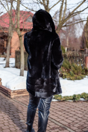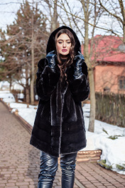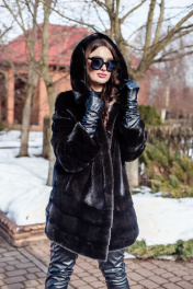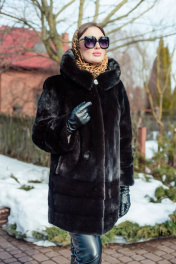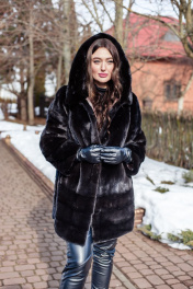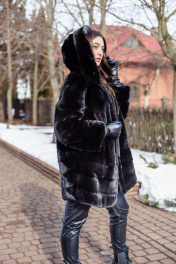 Полупальто Камелия 85 выполнено из натуральной норки. Длина изделия - 85 см. Прямой силуэт, по низу изделия вшита кулиска с фиксаторами. Модель выполнена из пластин цельной норки. Снизу изделия 3 полоски под углом. Рукав полуреглан, выполнен из цельной норки, снизу 2 полоски под углом. Есть плечевые накладки, а также кулиска с фиксаторами по низу рукавов. Капюшон на пуговице с дополнительным крючком. Прорезные карманы по бокам. Изделие на шубных крючках.