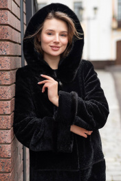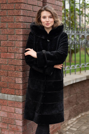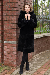 Пальто Линия 190 из овчины (астраган).прямого силуэта. Длина изделия 105 см. Полочки и спинка до бедра цельные, ниже - росшив с замшей. Полуреглан рукав с плечевыми накладками. По низу манжеты рукавов вшит кант из норки. Классический глубокий капюшон с опушкой из норки выступает элегантной заменой шапке. Изделие на шубных крючках. Сверху пуговица. Прорезные карманы.