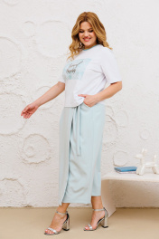 Стильный и удобный юбочный женский комплект. Изделие состоит из двух предметов: футболки и юбки на запах. Данный комплект отличный вариант как для торжеств, так и для повседневной носки. Футболка свободного кроя выполнена из хлопковой ткани. Рукав укороченный, круглая контрастная горловина, перед и спинка прямые. По переду изделие украшено принтом. Футболку с легкостью можно носить как навыпуск, так и заправленной. Удлиненная юбка на запах идеально сидит на любой фигуре, подчеркивая все достоинства и скрывая недостатки. Юбка свободного кроя на притачном поясе, застегивающимся на полукольца. По переду два кармана в боковых швах. Передняя часть юбки по верху имеет две талиевые складки, задняя часть цельная прямая имеет две талиевые вытачки. С данным комплектом можно смело создавать стильные образы как вместе, так и по отдельности. Длина футболки по спинке 52см +-1 см, длина рукава 27см ± 1см. Длина юбки по боковому шву 92см +-1см. Изделие подойдет на рост 170 см.