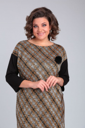 Коричневое платье из трикотажа с разрезом и брошью Michel chic 2150 черный-горчичный - фото 1