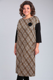 Коричневое платье из трикотажа с разрезом и брошью Michel chic 2150 черный-горчичный