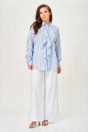 Свежая и выразительная модель, которая легко собирает образ. Небесно-голубая полоска оттенка «Морской бриз» визуально облегчает силуэт и делает образ аккуратным и современным. Силуэт классической рубашки: воротничок, застёжка на пуговицах по переду, длинный рукав с манжетами на пуговицах. Свободный крой деликатно выстраивает силуэт, не обтягивая фигуру. Рубашечная ткань держит форму и остаётся аккуратной в течение дня. Главный акцент модели — мягкий архитектурный волан по переду. Он добавляет движению ткани лёгкость и делает рубашку более женственной и выразительной. Особая деталь — стразы на воротнике в виде маленьких капелек, которые напоминают капли морского бриза и добавляют образу деликатное мерцание. Легко сочетается с брюками, джинсами и юбками. Сохраните, чтобы не потерять — такие модели быстро становятся любимыми. Изделие подойдет на рост 170 см.