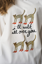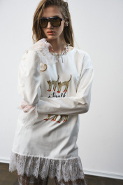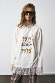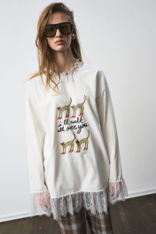 Лонгслив свободного силуэта, с принтом. Французское кружево по низу изделия и рукавов. Два универсальных размера - S (соответствует 42-44-46), L (соответствует 48-50-52)