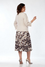 Комплект женский, состоящий из жакета и платья. Жакет приталенного силуэта. Округлый вырез горловины и борта. По полочке-карманы с листочкой и клапанами. Рукав втачной, с разрезами по низу. По переду-застёжка на петли-пуговицы. Жакет без подкладки (летний вариант). Платье приталенного силуэта, со свободной юбкой, на подкладке. Округлый вырез горловины. Рукав втачной, короткий. Застежка на молнию в боковом шве. В комплекте-пояс в цвет жакета. Длина по спинке жакета-53см, длина рукава-30см. Длина по спинке платья-113см, длина рукава-19см.
