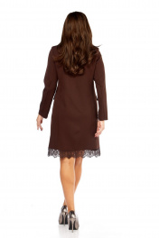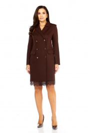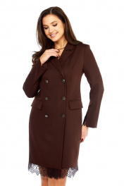 Двубортный жакет-платье, полуприлегающего силуэта, из костюмной ткани, без подкладки. Воротник-с отложными лацканами пиджачного типа, рукава – двухшовные. По переду – вытачки, прорезные карманы с клапанами и двумя листочками. Жакет имеет 6 пуговиц и одну потайную. По низу изделия и в шве рукава используется кружево, для придания романтизма классическому образу. Длина плечевого шва - 12 см, длина рукава - 61 см, длина изделия по спинке - 91 см и 97 см с кружевом.