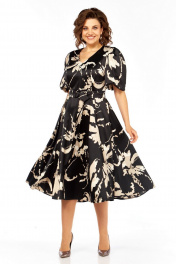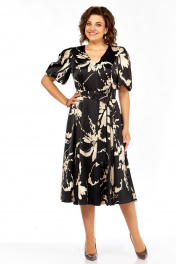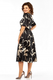 Платье полуприлегающего силуэта, без подкладки, длины миди. V-образный вырез горловины, рельефы по груди. Рукав-фонарик. Платье отрезное по линии талии, юбка-шестиклинка. Сбоку застежка на молнию. В комплекте идет пояс с пряжкой из основной ткани. Длина плечевого шва - 9,5 см, длина рукава - 35 см, длина изделия по спинке: до талии - 40 см, до низа - 120 см.