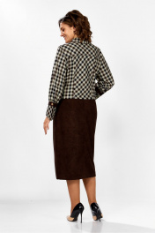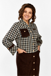 Женский комплект, состоит из жакета и юбки. Жакет выполнен из текстильной ткани в клетку, в качестве отделки штрукс. Горловина обработана воротником со стойкой, застежка по переду на пуговицы. На полочке обработаны рельефы и кокетки, также на полочке обработан накладной карман с клапаном из штрукса по одной стороне, по второй нашивка. Спинка идентична полочке, рукав втачной, по низу с манжетой из штрукса и текстиля в клетку, застегивается на пуговицу. Юбка выполнена из штрукса, с застежкой по переду на планку с пуговицами. Верхний срез обработан притачным поясом, по переду обработаны вертикальный подрезы и карманы. Заднее полотнище юбки со средним швом и вытачками. Эффектный и стильный комплект для вашего осеннего образа! В 52р Блузка: Ширина груди- 56см, Ширина талии -54см, ширина бедер -см, длина рукава- 58см, ширина рукава 20см. Юбка: Ширина бедер -58см, Ширина талии- 47см. Длина блузки 50см, длина юбки 78см.