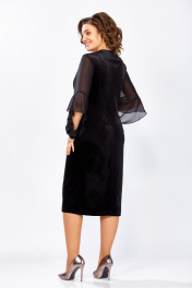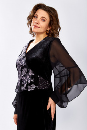 Женское платье, полуприлегающего силуэта, выполнено из велюра и шифона, в качестве отделки кружево. Горловина платья V-образной формы на обтачке, на полочке выполнен ассиметричный подрез, декорированный кружевом, шов притачивания декорирован аппликацией из кружева. Также на полочке, в качестве отделки, обработан декоративный элемент со стразами. Рукав втачной, выполнен из шифона, расклешенный к низу с подрезом по линии локтя и от линии локтя разрез, который по низу рукав на манжете. Спинка выполнена из велюра, со средним швом и вытачками. Эффектное платье, выполненное из стрейчевого велюра, отлично садится по фигуре, а шикарное кружево придает платью нарядности! в 52р. Ширина груди- 53см, Ширина талии -54см, Ширина бедер- 63см, длина рукава- 60см, ширина рукава 22,5см.