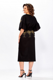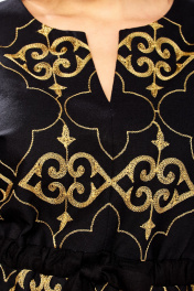 Женский комплект полуприлегающего силуэта, состоит из блузы и юбки, выполнен из однотонного льна и льна с вышивкой. Блуза свободного покроя, прилегание по талии регулируется при помощи кулисы, можно как заузить изделие по талии, так и немного расслабить. Также на полочке обработана горловина округлой формы, с обтачным разрезом посередине. Полочка выполнена из льна с вышивкой, кулиса по линии талии из однотонного льна. Спинка идентична полочке, выполнена из однотонного льна, баска из льна с вышивкой. Рукав цельнокроеный, укороченный, по низу притачен широкий манжет, присборенный по линии притачивания, выполнен из однотонного льна. Юбка прямого силуэта, выполнена из однотонного льна, по переднему полотнищу выполнен вертикальный подрез, по низу обработан разрез. Верхний срез обработан поясом с резинкой, застежка по переду на молнию и петлю-пуговицу. Эффектный костюм с яркой вышивкой золотом может использоваться не только как повседневный комплект, но и прекрасно подойдет для торжеств и мероприятий! В 52р Жакет: Ширина груди- 58см, Ширина талии -55см резинка, Ширина бедер- 61см , Длина рукава 40см, Ширина рукава 24см Юбка: Ширина талии -42см резинка, Ширина бедер- 58см. Длина блузки 59см, длина юбки 76см.